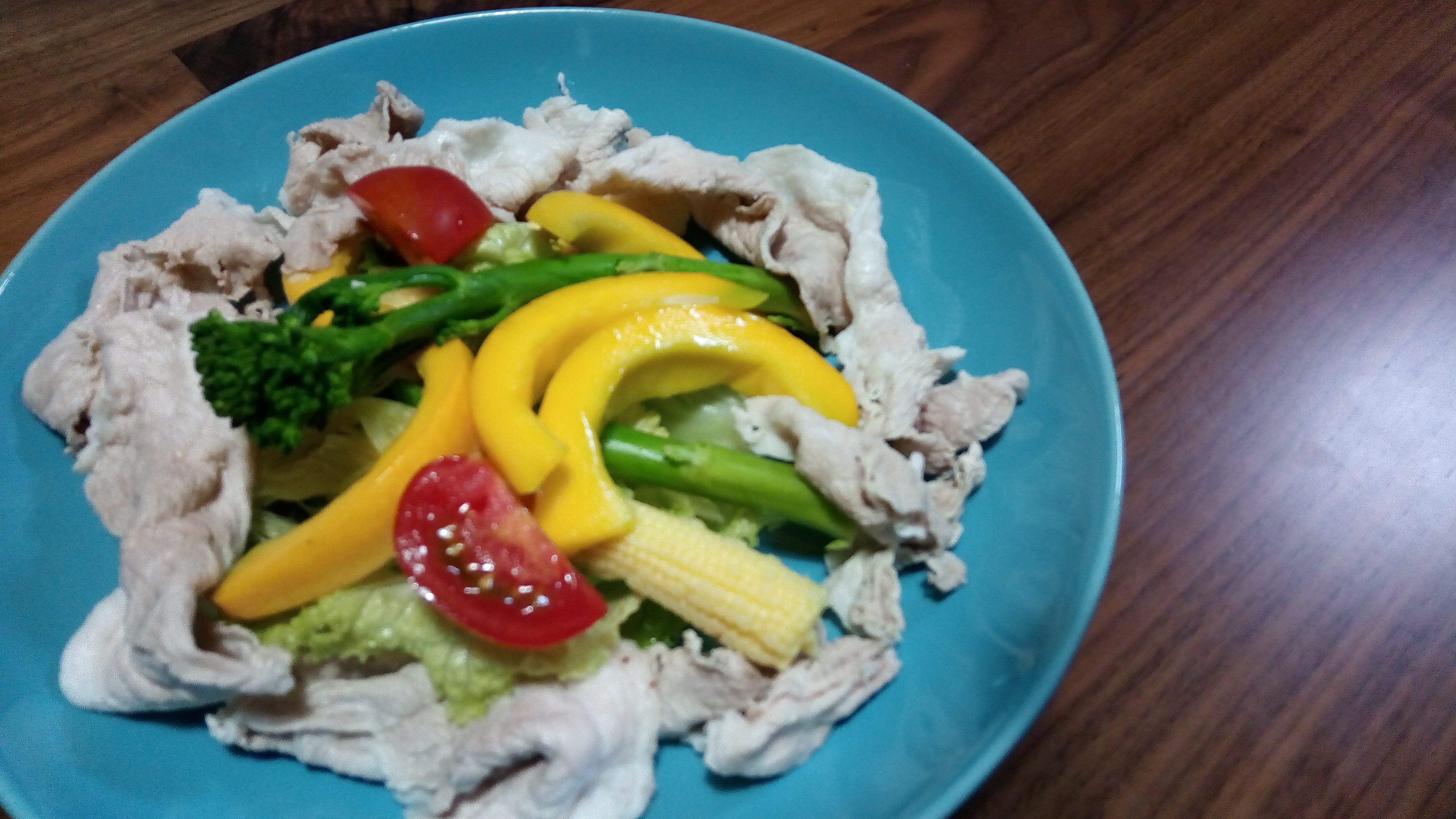 サラダかぼちゃのコリンキーは生食できるかぼちゃなのですが、すこし生食だと青みがあるかな?と感じたので切った後軽く湯がいて冷しゃぶにトッピングしました♪